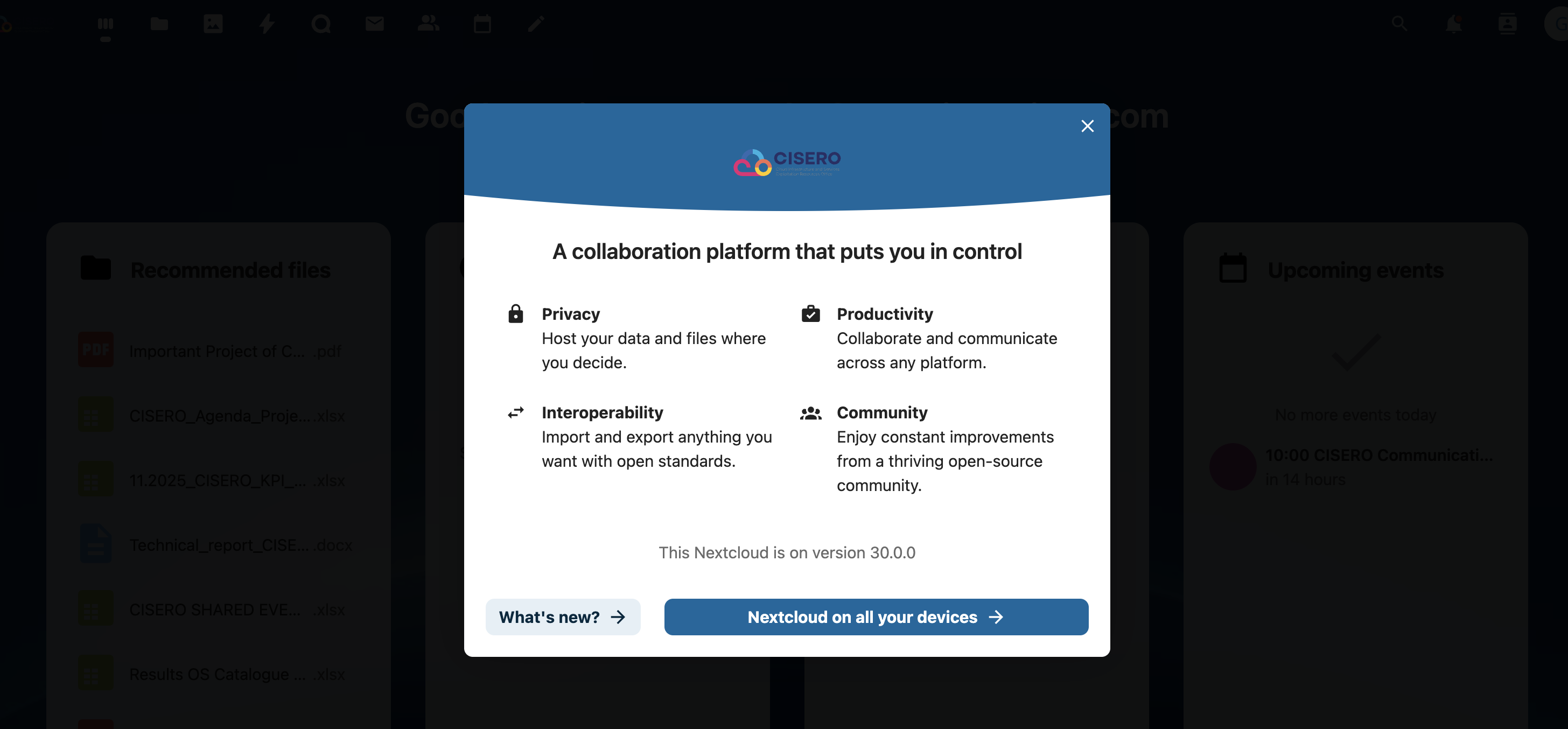 The CISERO NextCloud has been launched ahead of the full platform to provide early collaboration capabilities to our community. We believe in delivering value as quickly as possible, which is why we're making these essential features available now rather than waiting for the complete platform rollout. This early access version is a collaboration platform that puts you in control, offering privacy by allowing you to host your data and files where you decide, productivity through seamless collaboration and communication across any platform, interoperability by enabling you to import and export anything you want with open standards, and the benefits of a thriving open-source community that ensures constant improvements. We don't want to stop there — our goal is to continuously expand and enhance these features based on your needs and feedback.